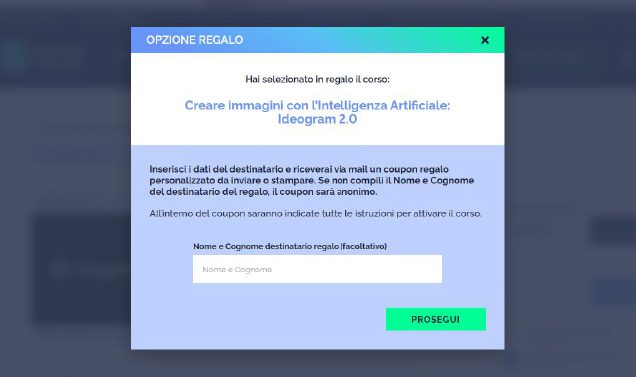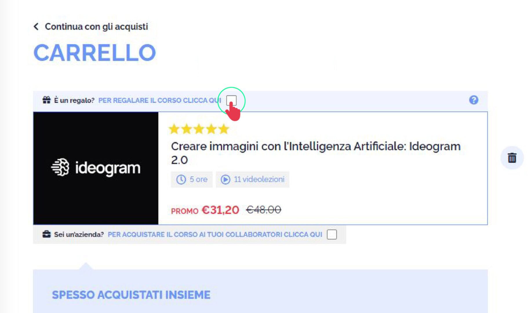Nel carrello puoi cliccare l’opzione “È un regalo?”, inserire il nome del destinatario e aggiungere una dedica personalizzata. Riceverai un’email separata con il coupon regalo e le istruzioni per attivare il corso.