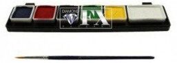 Tavolozza 6 colori Essenziali Mini è ideale per il primo approccio al trucca bimbi, facepainting. Economica, pratica, essenziale e di alta qualità, La palette è composta da: -un contenitore in plastica con coperchio; -1 Pennello; -6 colori Essenziali ( Giallo, Verde, Nero, Bianco, Rosso, Blu), materiali fondamentali per iniziare. Utilizzati dai migliori truccatori a livello professionale sia in Italia che all’estero e dispongono del doppio certificato EU ed FDA. I colori Diamond Fx necessitano di una piccola quantità di acqua e possono essere applicati sia con la spugna che con il pennello. Tutti i prodotti si possono rimuovere dal viso o dal corpo con un po’ di acqua e sapone. Tenere lontano dalla portata di bambini di età inferiore ai 36 mesi a causa di piccole parti che possono causare soffocamento. Conservare in luogo fresco ed asciutto e chiuso dal coperchio quando il prodotto non viene utilizzato. Tutti i cosmetici possono, in rare occasioni, causare reazioni allergiche. Questo prodotto non deve essere applicato su pelle spaccata , irritata o sensibile.